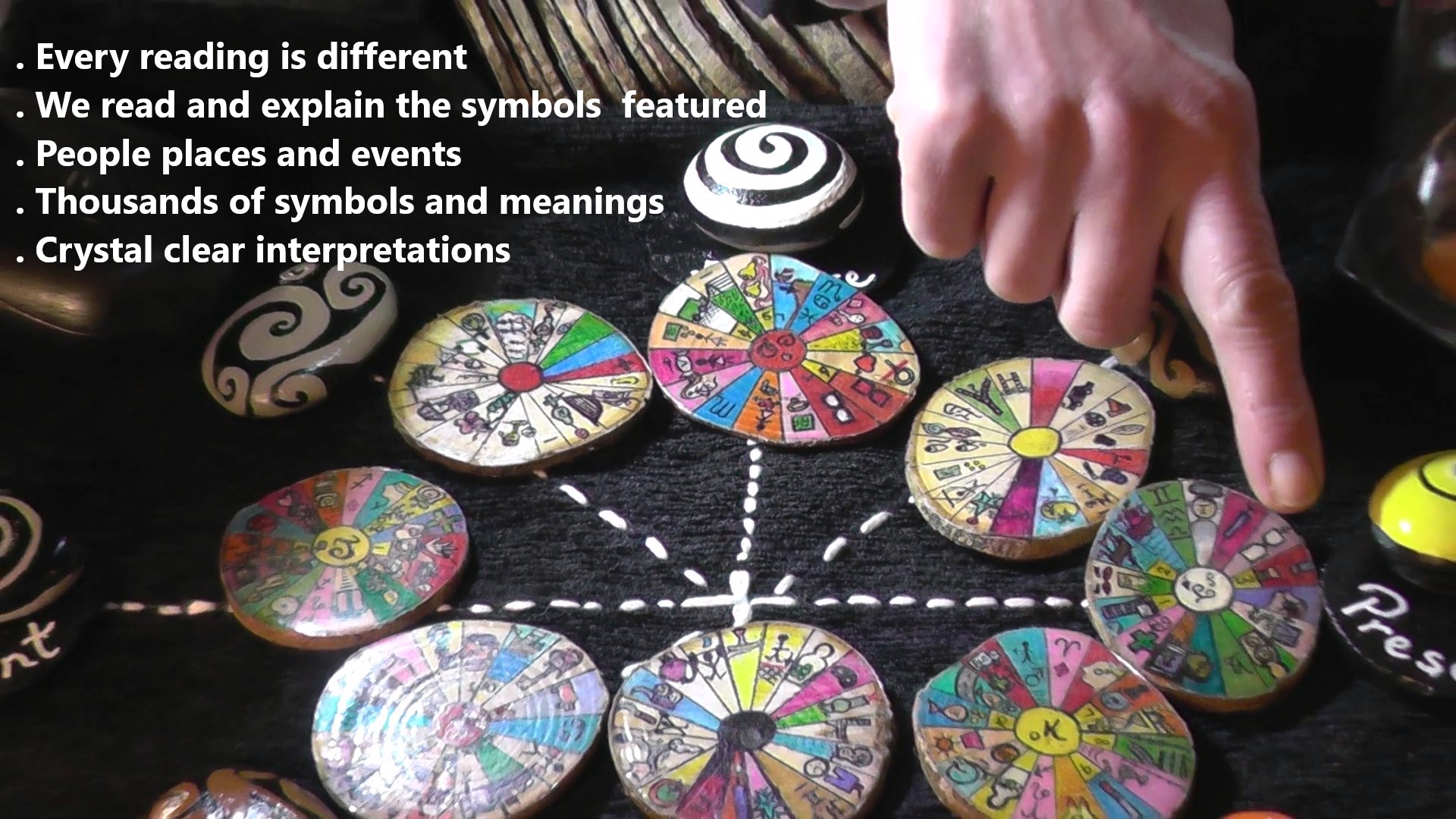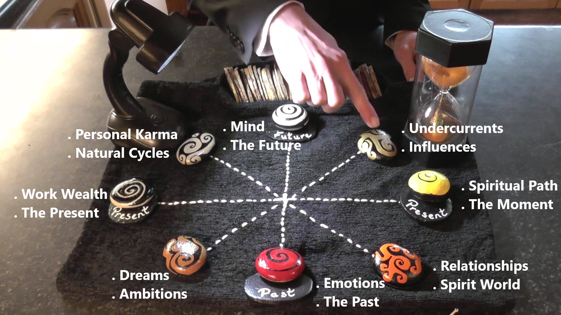 Wooden discs are shuffled and placed in the medicine wheel, their meanings are explained